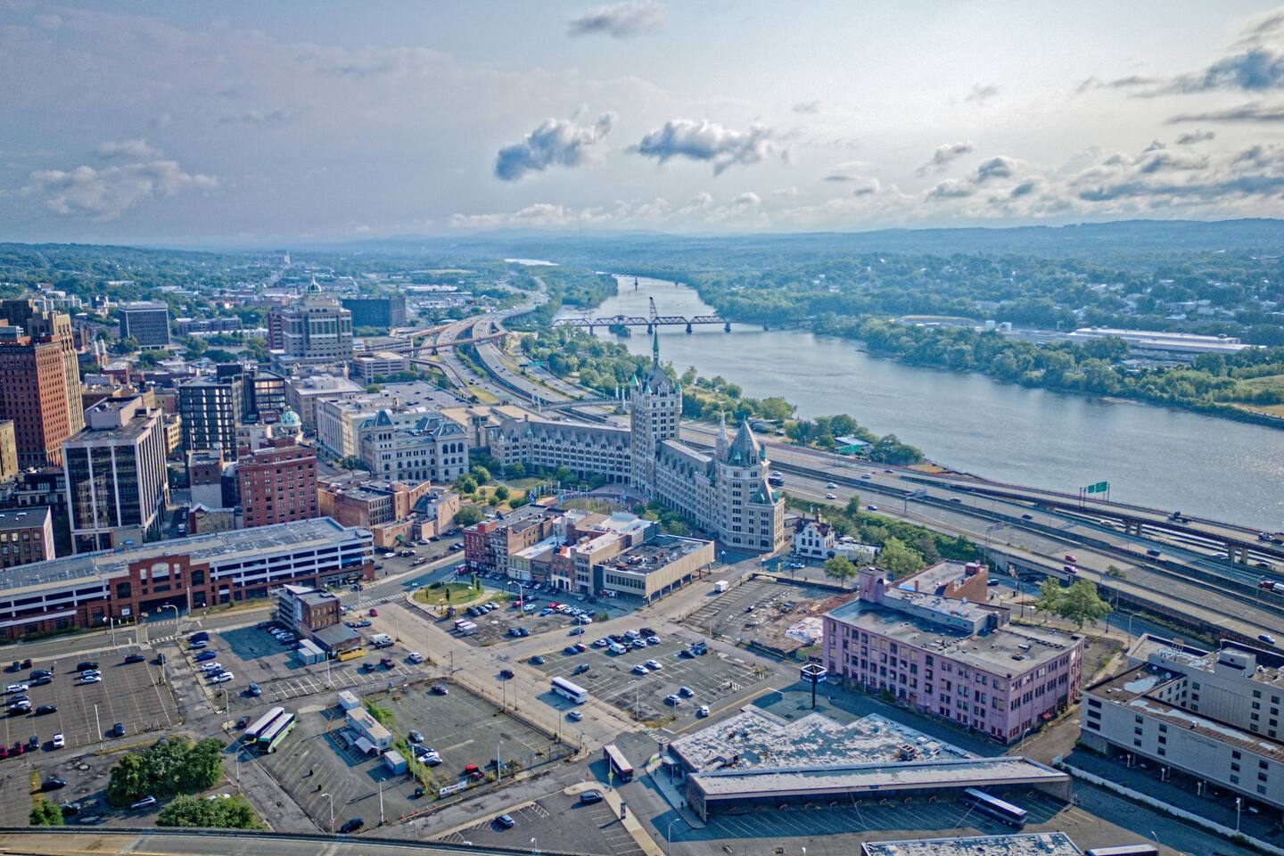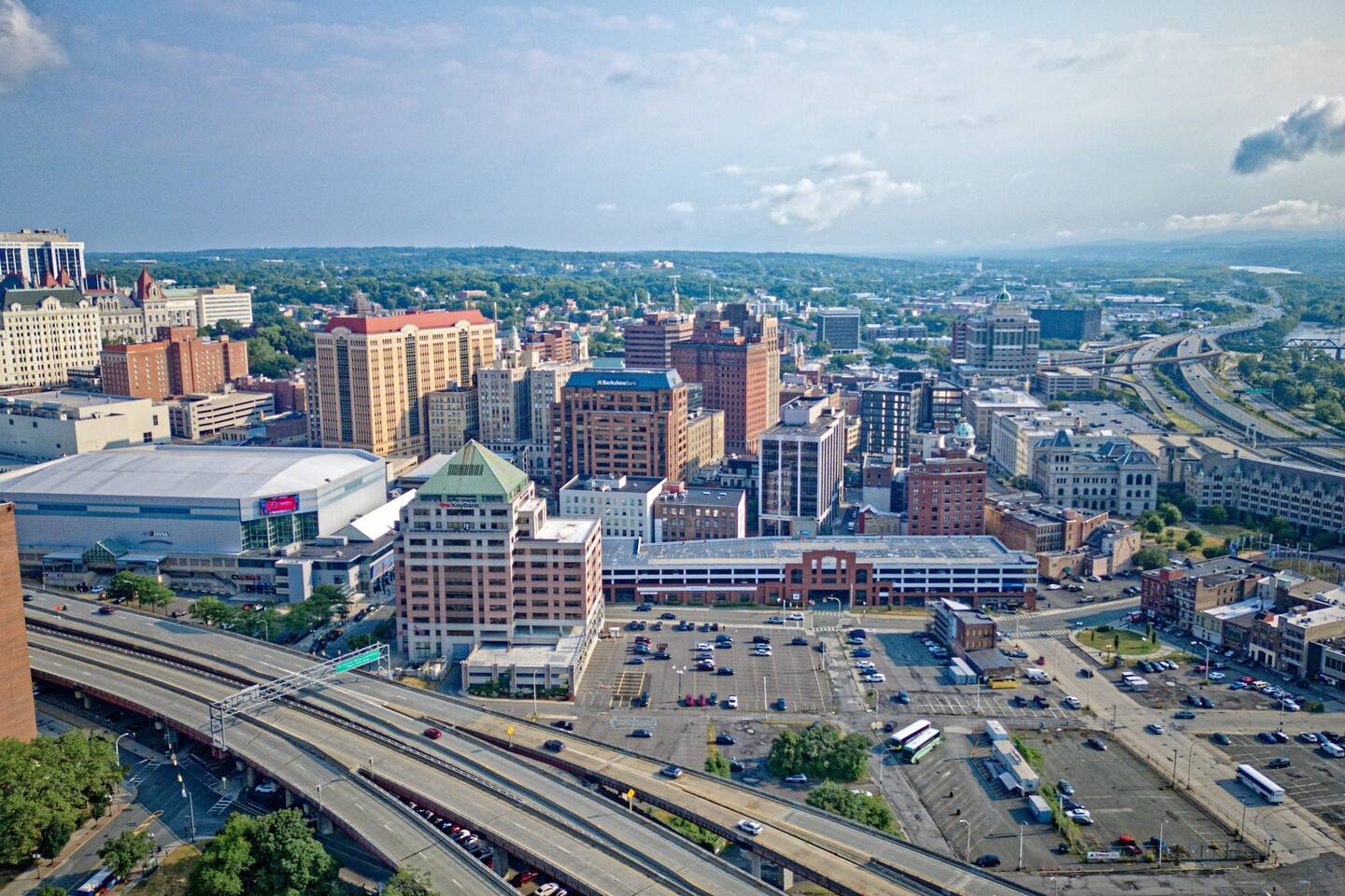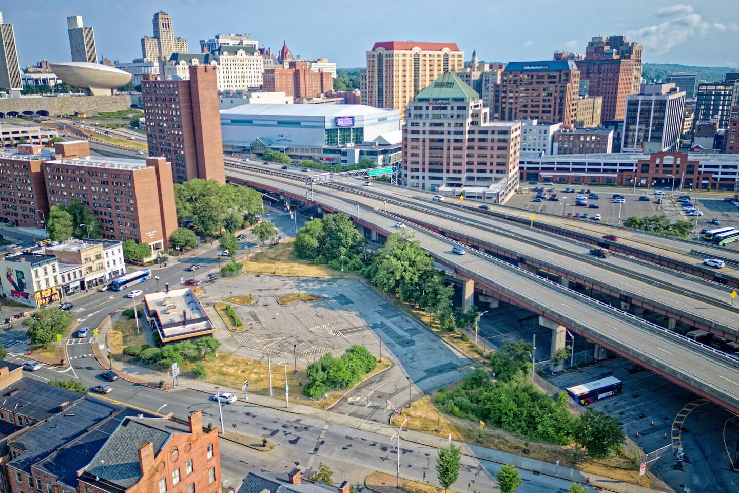 + PLENTY of metered parking in front ($0.50/hour, free after 5 PM until 8 AM and on weekends). + Easy access to I-787, I-87, and I-90. + Local bus route 1 block away. + Greyhound bus station across the street. + ParkAlbany garages