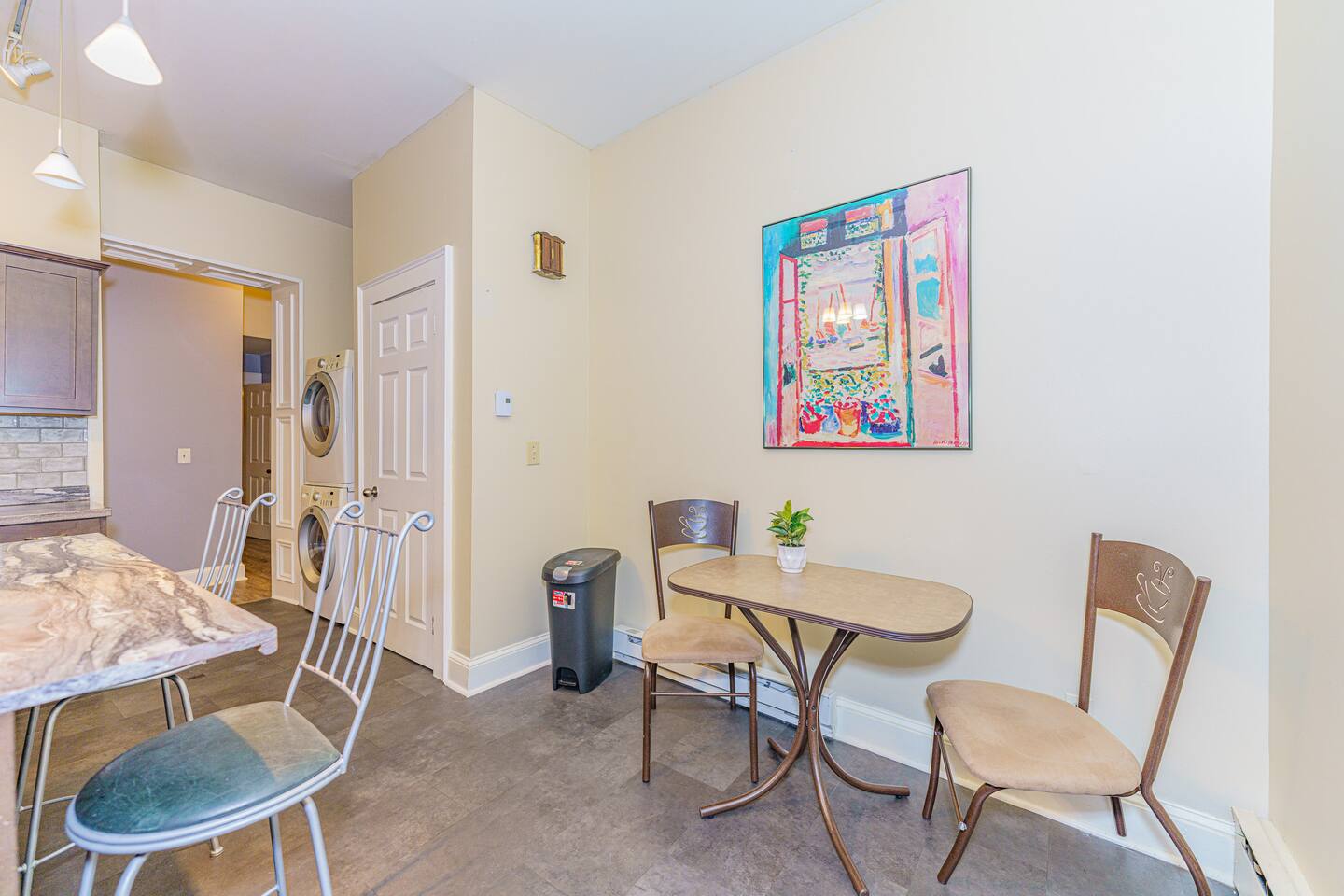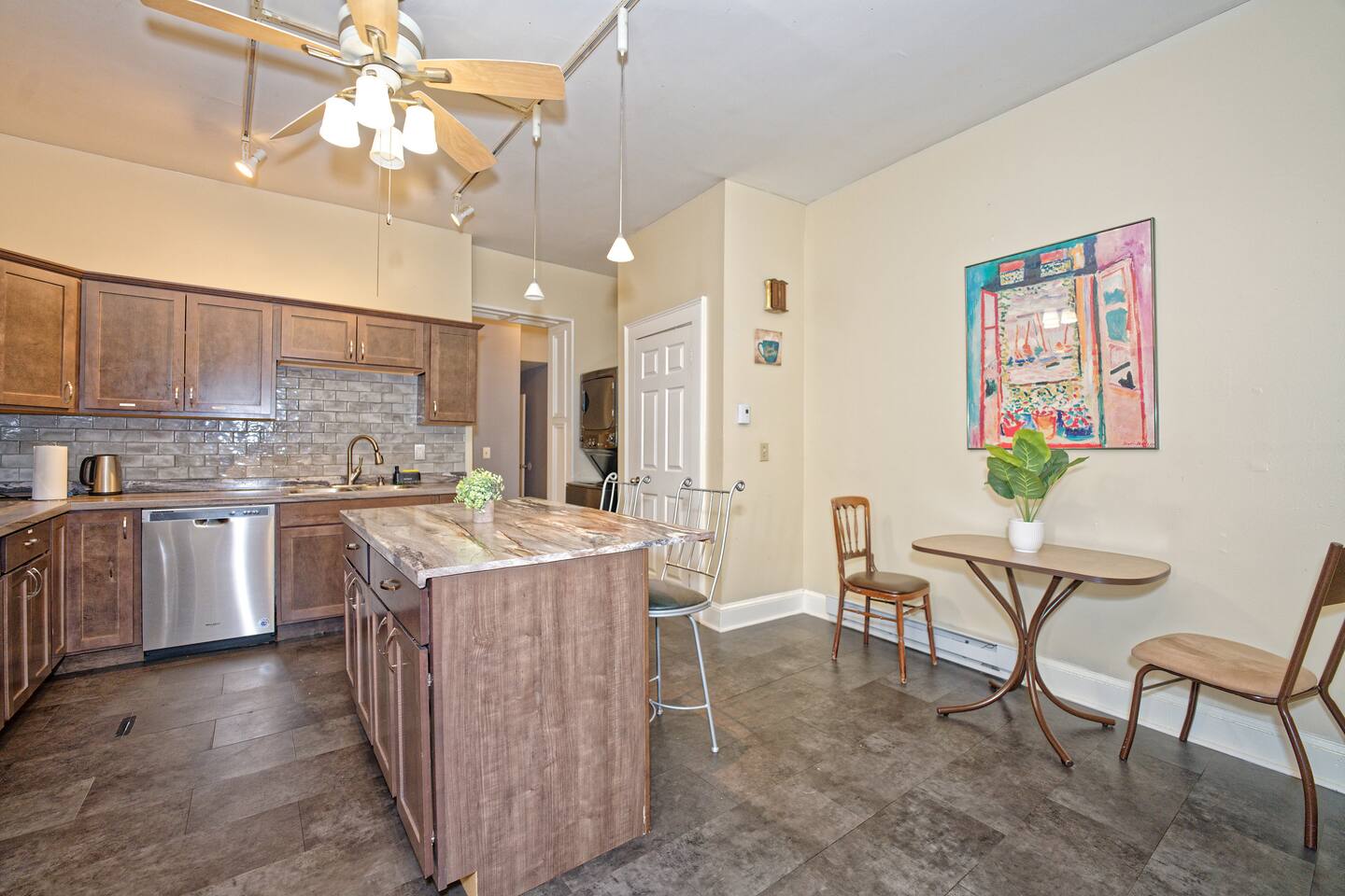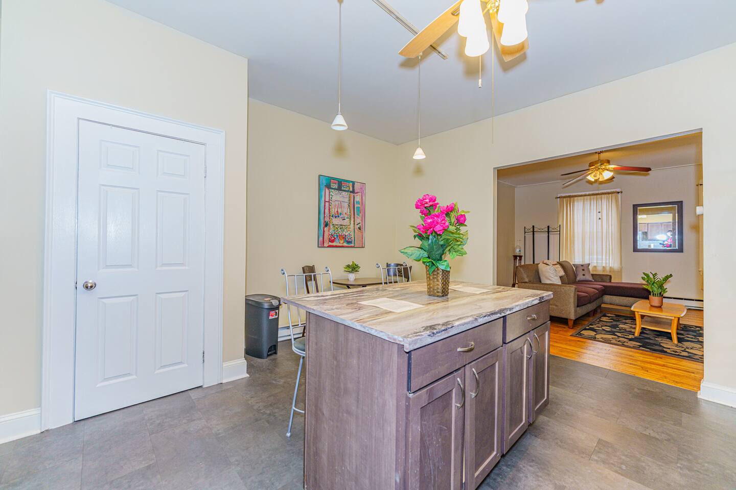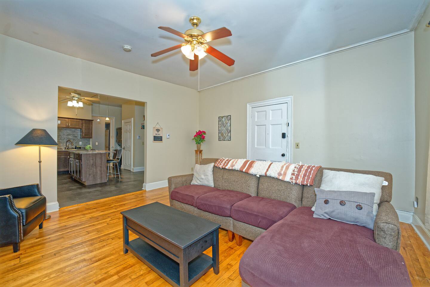 Enjoy your privacy in a quiet neighborhood steps away from major Albany attractions! + Beautiful 1st floor apartment (6 steps above ground level) + Guests will have entire 1st floor plus back patio + Sectional with 55" 4K Roku TV + Full kitchen w/ 4-seater island and 2-seater breakfast corner + Dedicated workspace + Full bathroom with toiletries + 1 King bed in main bedroom + 1 Queen bed in second bedroom + Sectional sleeps 1 or 2 smaller guests + Plenty of closet space + Chic, artistic environment with plants and personal touches + Washer and dryer + Front and back entrances + Access to a fenced backyard and private deck + Located in building designated as federal historic landmark -- NO SMOKING OR BURNING ON PROPERTY. ALL MARIJUANA AND CIGARETTE SMOKING ON-SITE BANNED. NO INCENSE ALLOWED. ABSOLUTELY NO EXCEPTIONS. -- NO PARTIES -- PLEASE BE RESPECTFUL OF NEIGHBORS